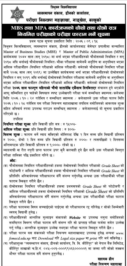 Tribhuvan University, Faculty of Management, Dean Office, Examination Controller Directorate publishes the exam form application notice for Master of Business Studies (MBS) and Master of Public Administration (MPA).