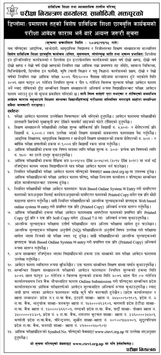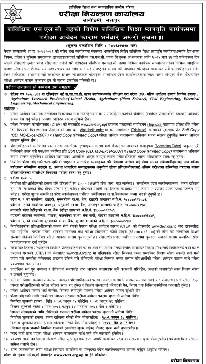Council for Technical Education and Vocational Training (CTEVT) has published form fill notice of Scholarship for Economically Underprivileged, Dalit, Earthquake Victim and Muslim students to study various Diploma/PCL as well as TSLC programs.
